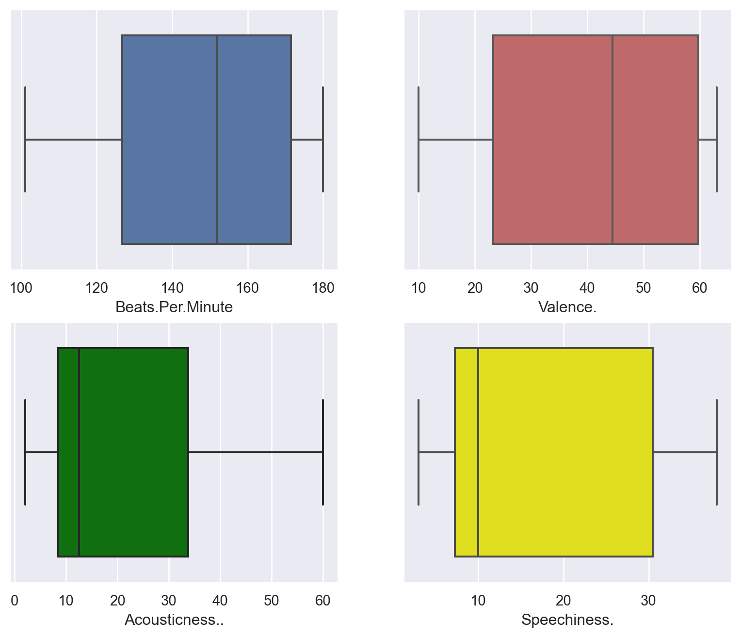 | Track.Name | Artist.Name | Genre | Beats.Per.Minute | Energy | Danceability | Loudness..dB.. | Liveness | Valence. | Length. | Acousticness.. | Speechiness. | Popularity | |