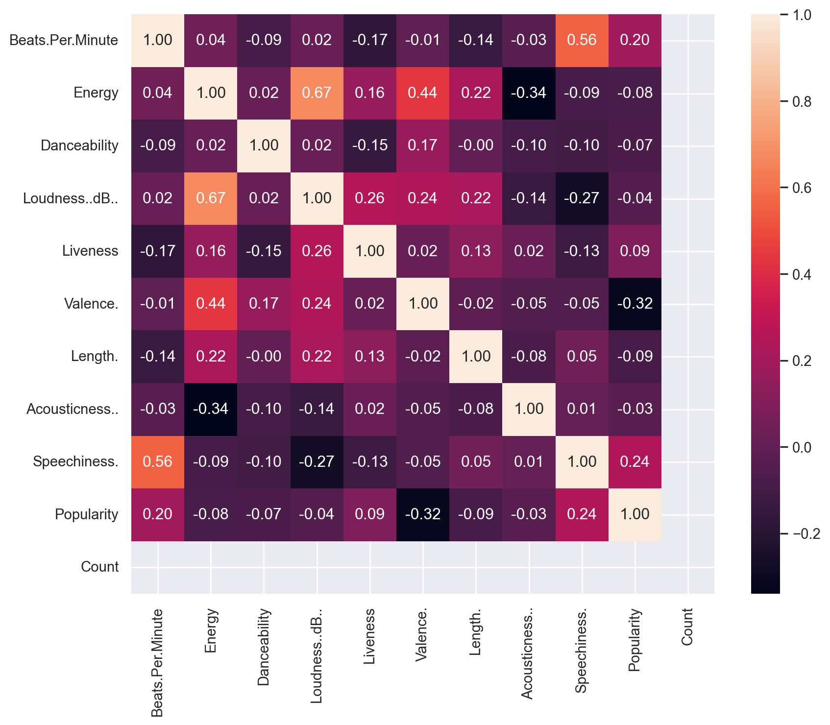 | Track.Name | Artist.Name | Genre | Beats.Per.Minute | Energy | Danceability | Loudness..dB.. | Liveness | Valence. | Length. | Acousticness.. | Speechiness. | Popularity | Count | |