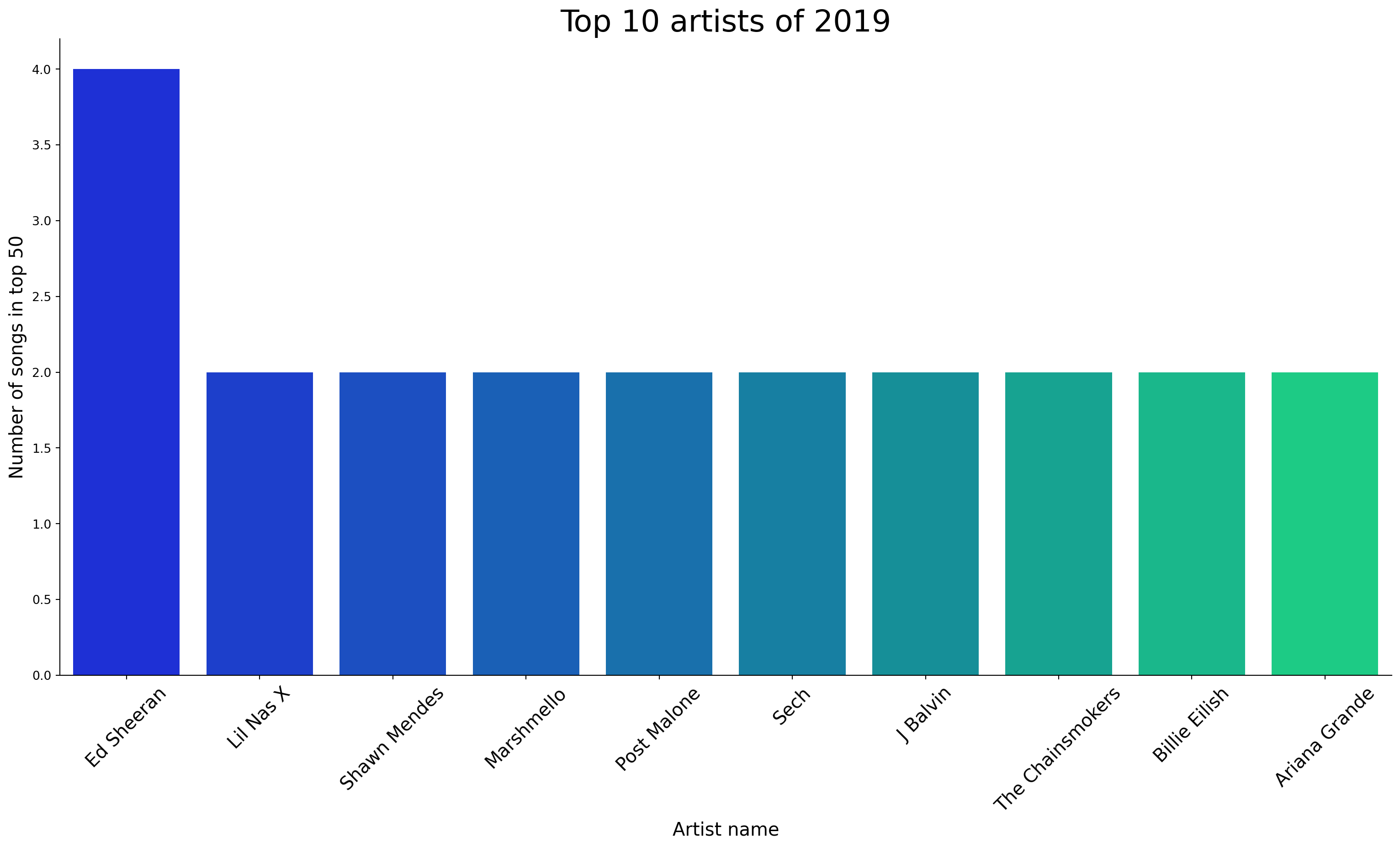 Let us check which artists featured most frequently in the top 50 songs. We will try to obtain the top 10 most popular artists of 2019.